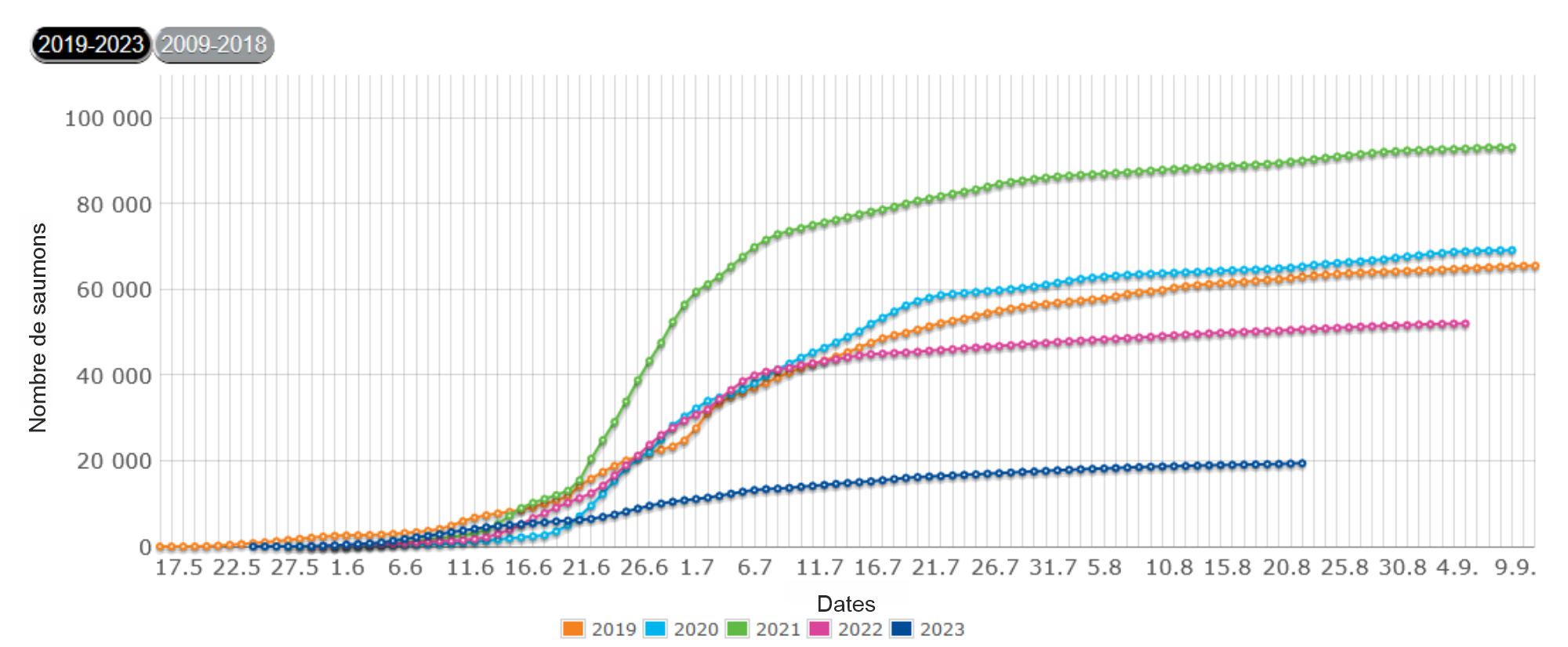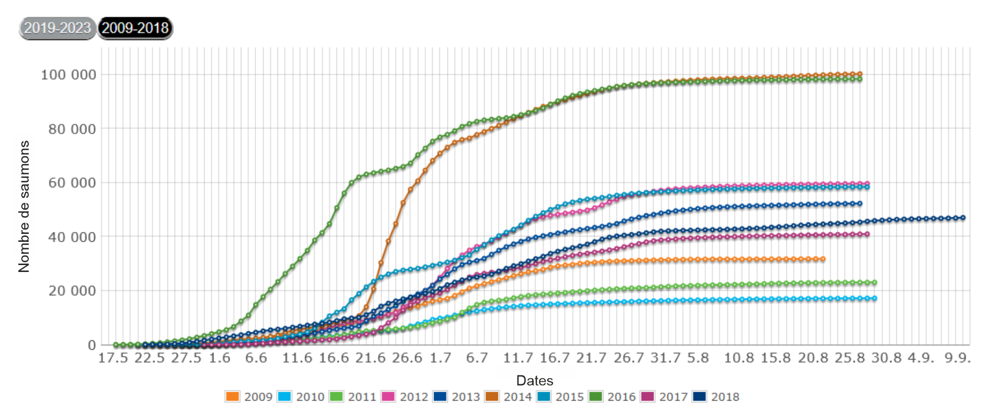En juillet et début août les dernières années ont été quasiment caniculaires et la température de l'eau peut devenir excessive pour les saumons. Mais, sur une saison 'normale', les conditions de pêche sont excellentes.